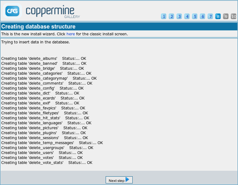 Coppermine needs write permissions in some sub-folders as suggested in Setting permissions. The installer can't set those permissions for you, so you need to set them in advance. If you have done so successfully, all folders that the install wizard checks in this stage should be marked as "OK". If this is not the case for you (i.e. if the install wizard complains about missing permissions in one or more folders), just leave the browser window as it is and set permissions properly. After having done so, return to the install screen that you have left open in your browser and refresh the page (by using the corresponding refresh button in your browser) to see if the permission issue has been solved.You can only click the next button if the needed permissions are set.