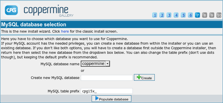 Coppermine's tables can co-exist in an existing database which has tables used by other applications. All coppermine tables will be using a different prefix from these, as specified here. You can even have several coppermine installs using one database - only the table prefixes have to differ in each case. Unless you know what you are doing, don't change the default value. |